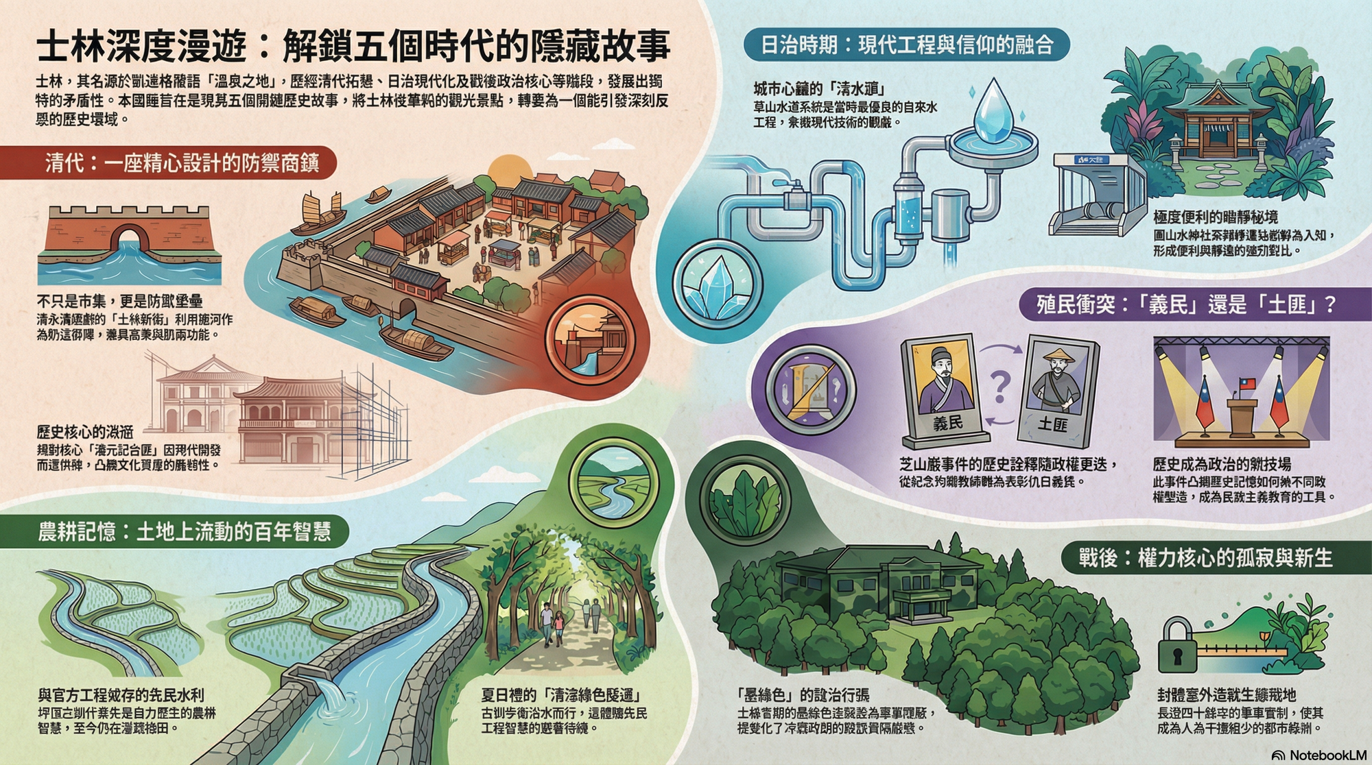 這五個故事,共同描繪出一個遠比觀光熱點更複雜、更深刻的士林。它充滿了內在的矛盾性——現代與傳統、權力與庶民、殖民與反抗在此並存,交織成一張複雜的歷史畫卷。這些故事提醒我們,真正的「秘境」,不只是人煙稀少的地方,更是那些能引發我們對歷史、身份與生存智慧進行深刻思考的空間。它們是士林更深層的脈動,等待旅人撥開夜市的蒸騰熱氣,去觸摸碑文的冰冷刻痕,去聆聽古圳的潺潺水聲。