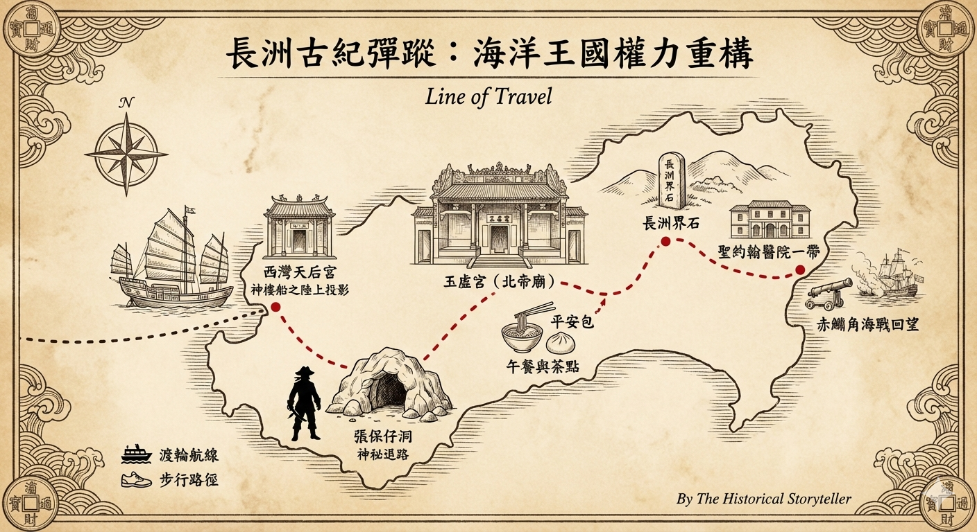 - 建議步行路線: 長洲碼頭 → 避風塘海傍(感受昔日神樓船巡行感)→ 西灣天后宮(歷史哨站)→ 張保仔洞(戰略幻影)→ 聖約翰醫院附近界石(階級與界線反思)→ 北帝廟(玉虛宮古物考察)。