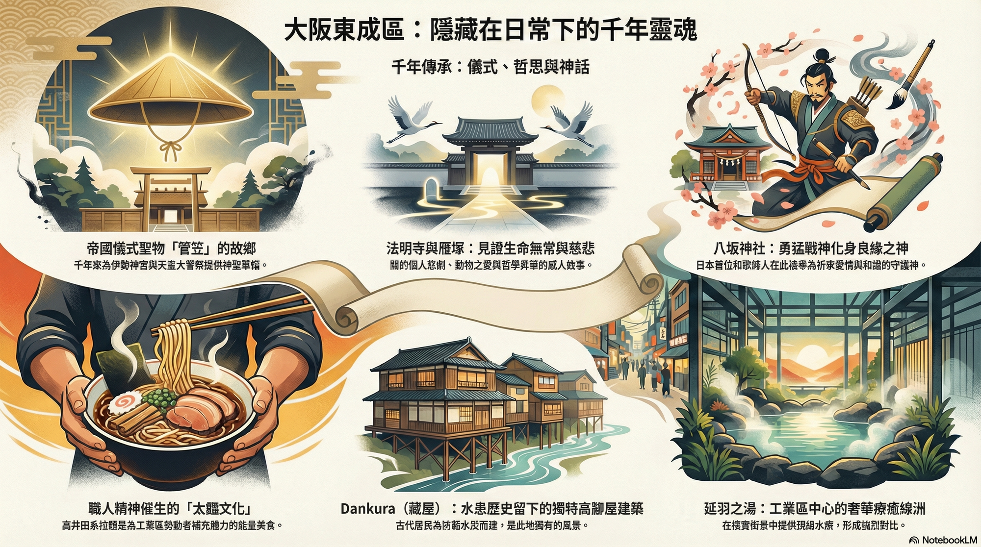 從深江濕地裡菅草的清香,到雁塚石塔前無言的靜默;從戰神浪漫的和歌,到一碗拉麵蒸騰的熱氣,再到鐵道旁溫泉的療癒水霧。這五個故事共同編織出東成區從古至今的身份認同,也告訴我們:歷史的偉大,不僅存在於宏偉的城堡與華麗的殿堂中,更深刻地烙印在庶民生活的每一個細節裡。