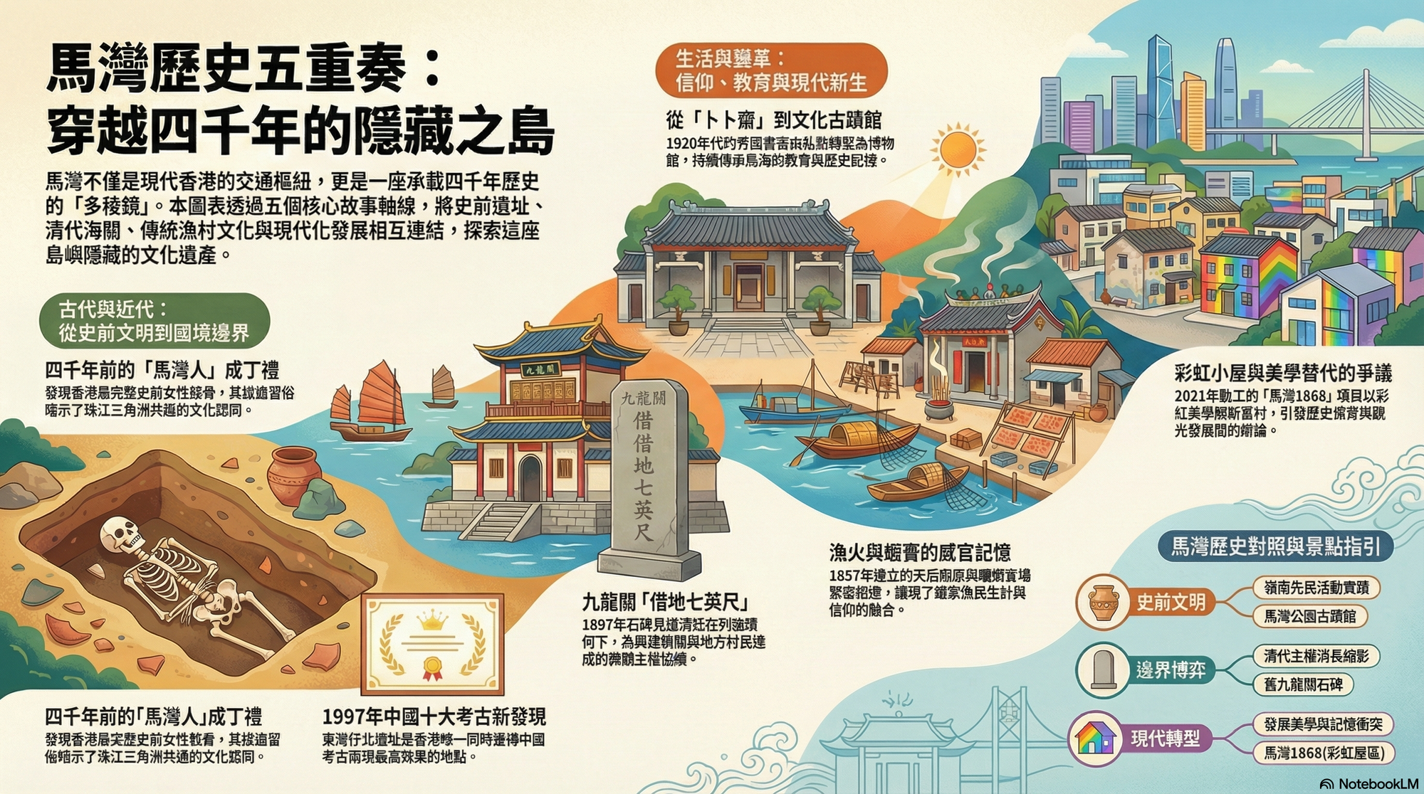 當人們提起馬灣,腦海中浮現的往往是橫跨海峽的宏偉青馬大橋,或是充滿童趣的挪亞方舟主題公園。然而,在這座島嶼現代化的光影之下,隱藏著一段跨越四千年的深邃歷史。它不僅是連接香港兩端的交通樞紐,更是一面折射香港歷史變遷的「多稜鏡」:從新石器時代的神秘部落,到清帝國末期的邊境海關,再到當代城市發展引發的社區變革。讓我們一同撥開現代化的光影,踏上一場徒步之旅,深入馬灣的歷史肌理,發掘五個被遺忘的故事。這是一趟重新認識島嶼靈魂的旅程,讓我們一起聆聽青馬大橋下那穿越時空的悠長回響。