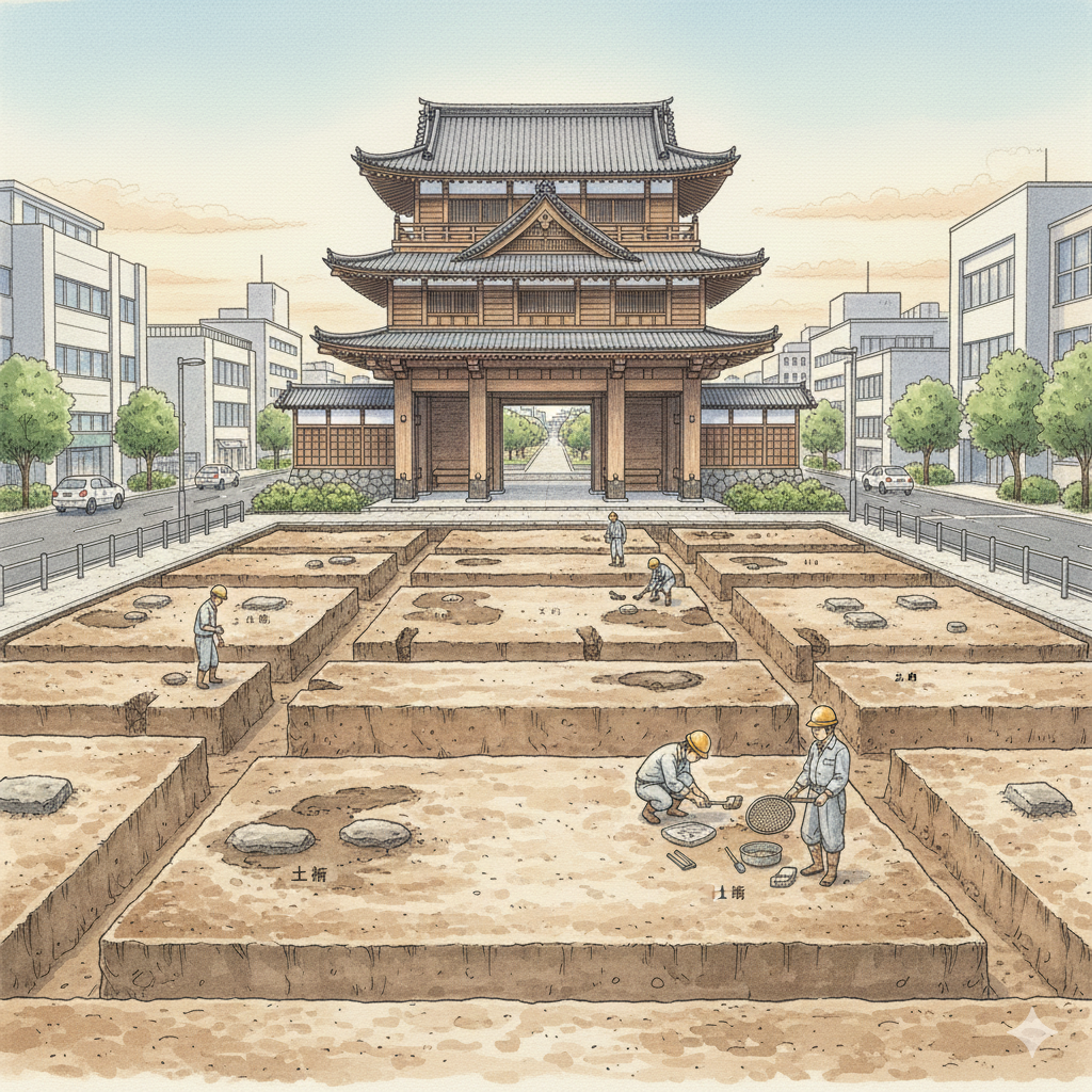 讓我們將目光從高大的建築移向腳下的土地。大手門周邊,曾是規劃嚴謹的武家屋敷區。考古發掘在現代街道之下,找到了屬於藩主重臣宅邸的土坑、溝狀遺構與礎石遺跡。這些破碎、隱蔽的痕跡,與氣派的城門形成了強烈對比。它們不像城門那樣訴說著權威,而是揭示了歷史的「裡子」:這些溝渠劃定了家臣們不可逾越的界線,而那些礎石則支撐過他們簡樸或華美的日常。這是一個比宏偉建築更真實、更細膩的歷史切片。