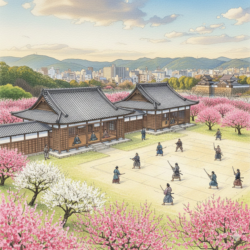 旅人常為偕樂園旁的水戶藩校弘道館所吸引,卻多半將其視為賞梅的附屬景點。這便錯過了水戶精神的核心。弘道館不僅是江戶時代規模最大的藩校,更是由德川齊昭公親手打造的一座「思想武器工廠」。當我們漫步其中,彷彿仍能感受到空氣中那股無形的張力——一邊是儒學講堂的肅穆沉靜,另一邊是練兵場傳來的 disciplined 喝斥聲,其目標正是培養「文武兼備」、既能引經據典也能揮刀上陣的武士。