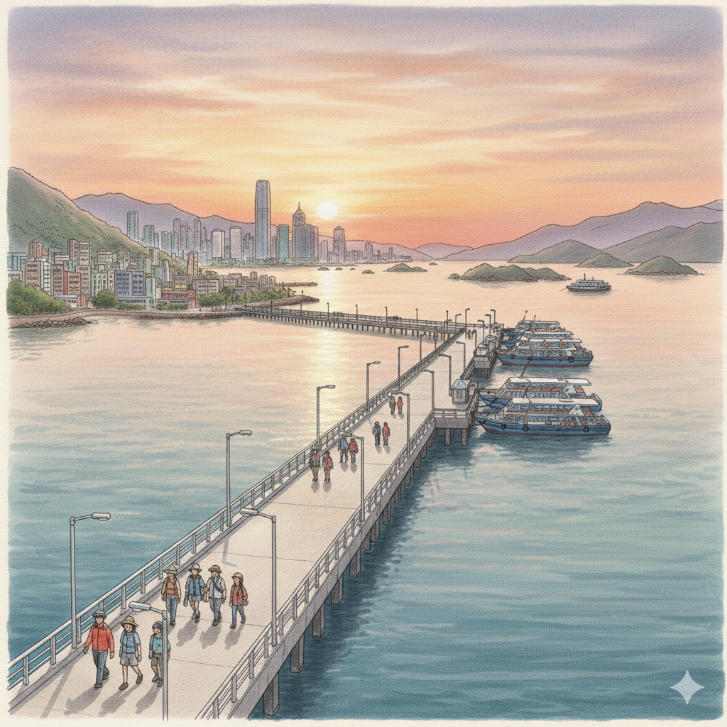 這條長長的碼頭,宛如一道伸向大海的歷史觸角,一端連接著香港的都市脈搏,另一端則指向一片被時光遺忘的客家文化與地質奇觀。
