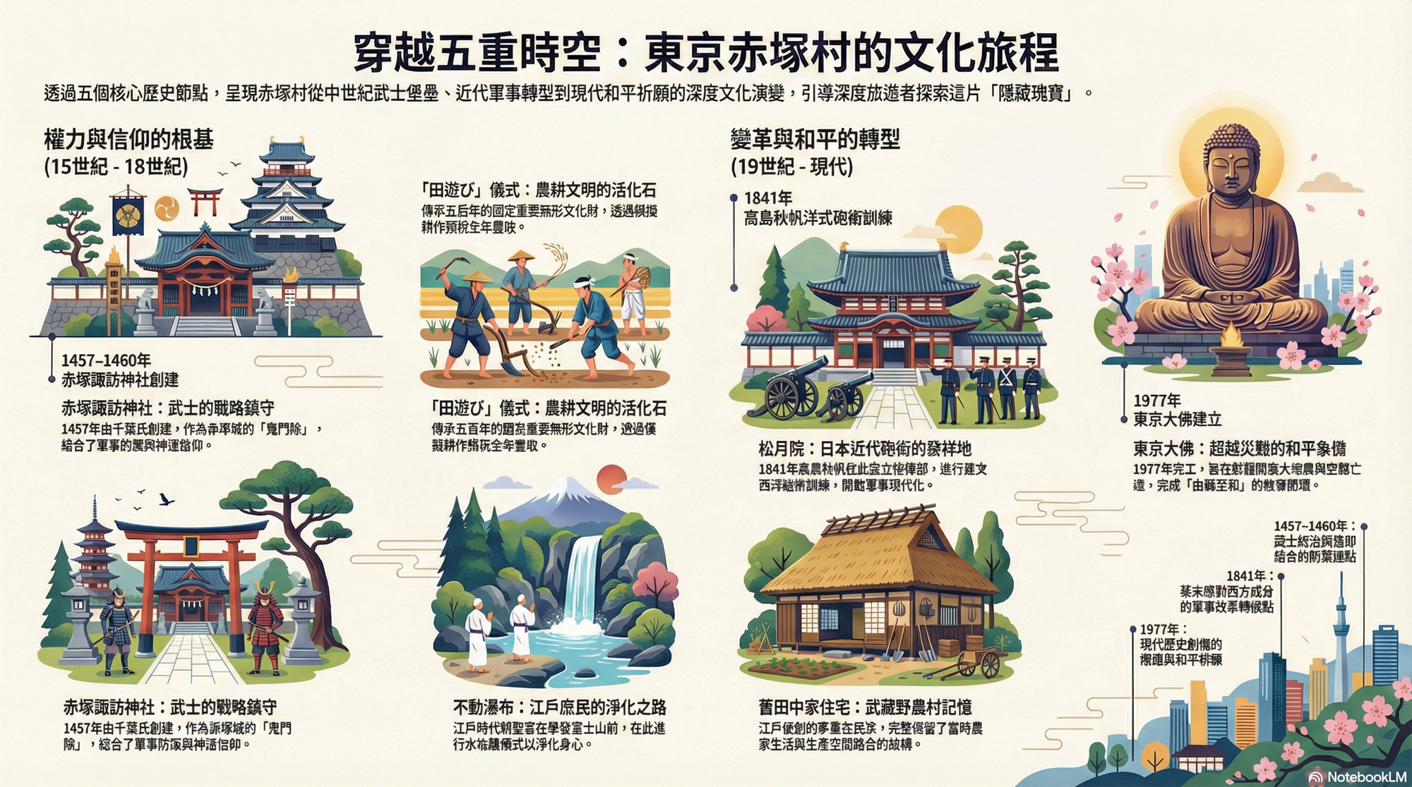 這趟穿越五百年的時空之旅,揭示了赤塚真正的魅力所在——那便是歷史的「連續性」與「功能轉變」。從諏訪神社的神道盾牌與松月院的近代砲聲,到不動瀑布的靈性洗滌與舊田中家承載的農耕記憶,最終在東京大佛的慈悲凝望中得到昇華,一個地方,可以在不同時代扮演截然不同的角色,從軍事要塞變為信仰中心,從朝聖聖地變為環境警示。
