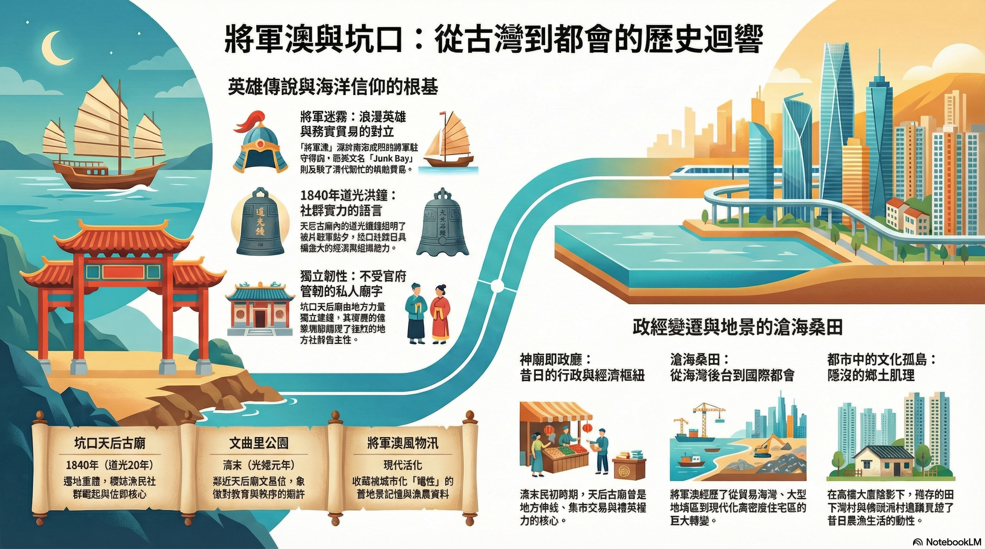將軍澳與坑口的歷史,歸根結底是一部關於韌性的篇章。它證明了香港的現代化發展,並非建立在對過去的徹底抹除之上,而是源於對舊有社群、地理和歷史記憶的深刻轉化。從抵禦外敵的將軍傳說,到天后廟庇護下的地方自治,再到新市鎮夾縫中殘存的村落痕跡,無不展現出社群在面對時代巨變時的非凡適應力與文化堅持。