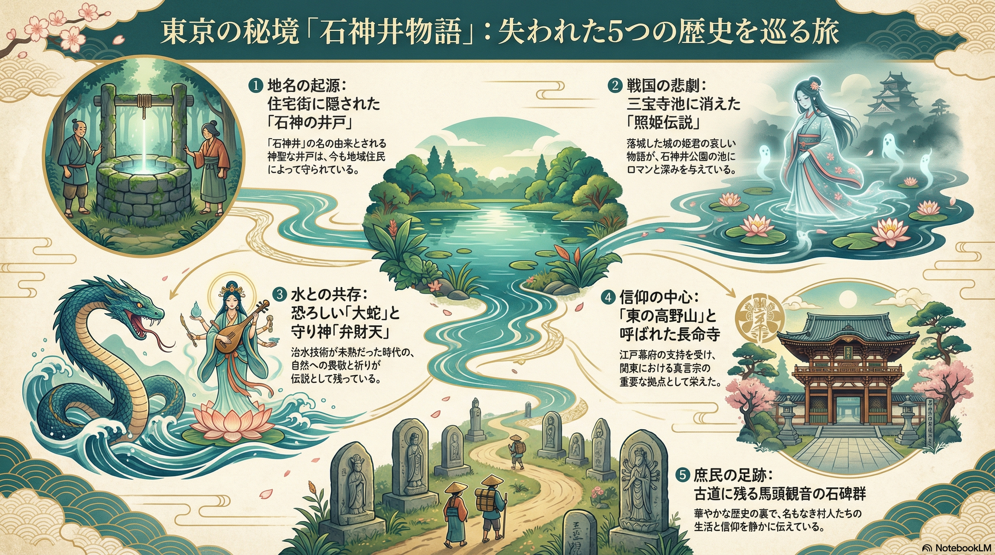 神が生まれた井戸、姫君の哀しみを映した池、畏れられ、そして鎮められた川。石神井の物語は、常に「水」を軸に紡がれてきました。東方の聖地を目指した壮大な寺院のビジョンも、古道に刻まれた庶民のささやかな祈りも、すべてはこの水の郷の記憶の一部です。これら五つの物語は、石神井を単なる東京の郊外住宅地ではなく、「東京の歴史の深層に佇む、水と霊性の郷」として鮮やかに浮かび上がらせます。