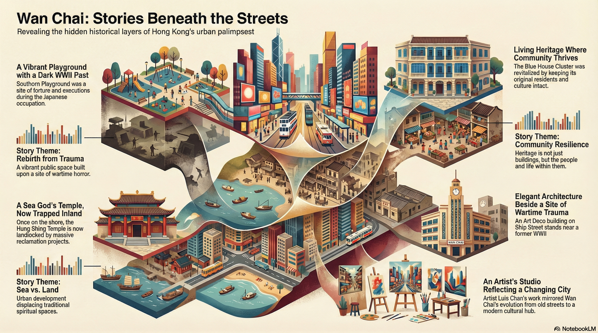 Tying these five stories together reveals Wan Chai as an "Eternal Palimpsest." The city’s vibrant modern identity is built quite literally upon forgotten coastlines, sealed over wartime scars, sustained by living communities, and captured in visionary works of art. Each layer adds depth and texture to the whole, reminding us that no city is ever just one thing.
