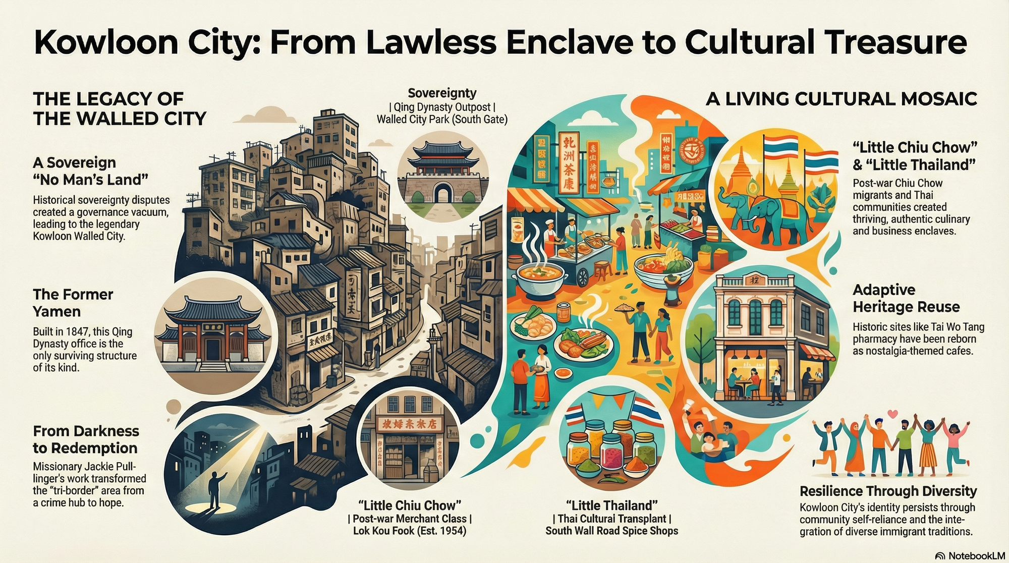 Taken together, these five stories paint a picture of Kowloon City that is far richer and more nuanced than the old myths of lawlessness. They reveal a place defined by astonishing resilience, profound diversity, and a paradoxical truth. The political marginalization that created the "three-unregulated" state, while fostering crime, also acted as an incubator for extreme self-reliance. This vacuum of official governance forced the creation of powerful internal support systems—seen in the grassroots compassion of Jackie Pullinger, the commercial kingdom of the Chiu Chow merchants, and the self-sustaining ecosystem of the Thai community.