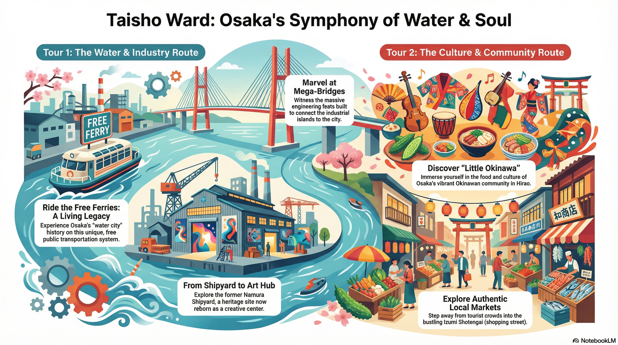 The true soul of Osaka resides in the seams. As Taisho Ward reveals, it lives in the quiet dignity of a free ferry, the artistic echo in an industrial ruin, the enduring song of a migrant culture, and the lively roar of a local market.