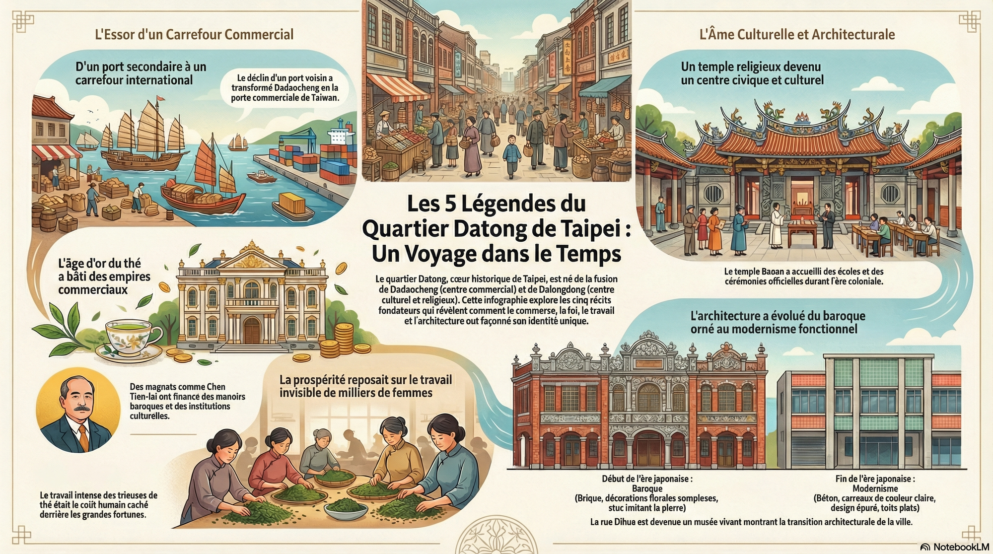 L'histoire de Datong n'est pas une narration linéaire, mais une série de couches superposées qui, ensemble, composent le portrait complexe et fascinant de Taipei. Chacun des cinq récits que nous avons explorés — le destin d'un port, la puissance du thé, le rôle d'un temple, le travail oublié des femmes et le dialogue des façades — est une clé pour déchiffrer la ville.