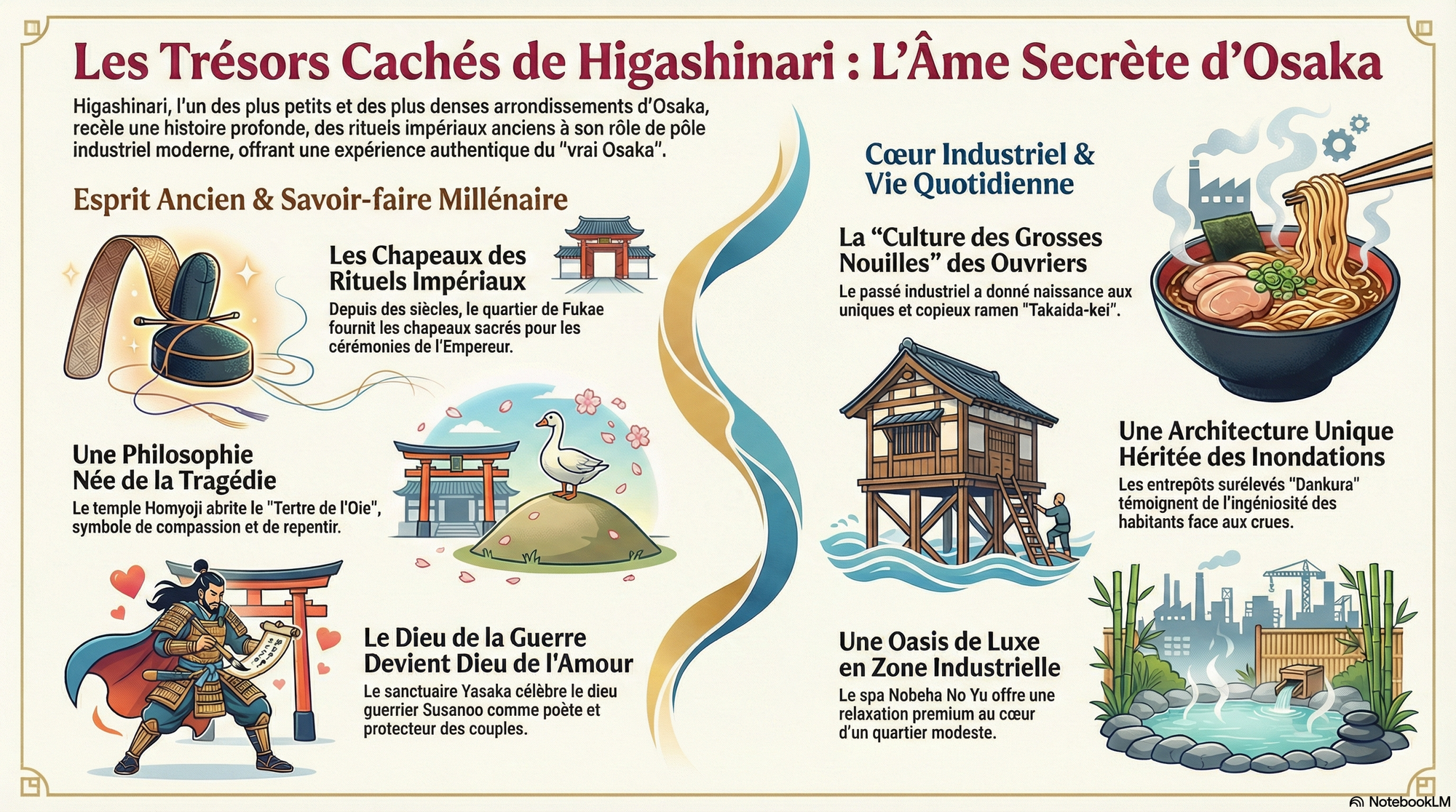 Cet article vous invite à un voyage différent, au cœur de l'arrondissement de Higashinari. À première vue, ce quartier densément peuplé, mêlant résidences et petites usines, pourrait sembler ordinaire. Mais en prêtant l'oreille à ses murmures, on découvre un lieu au riche passé, un conservatoire de récits millénaires et de traditions insoupçonnées. À travers cinq histoires surprenantes, nous allons dévoiler comment ce coin méconnu d'Osaka a coiffé des empereurs, médité sur le sens de la vie, célébré l'amour en poésie, nourri ses ouvriers et réinventé le bien-être urbain. Préparez-vous à changer votre perception du "vrai Osaka".