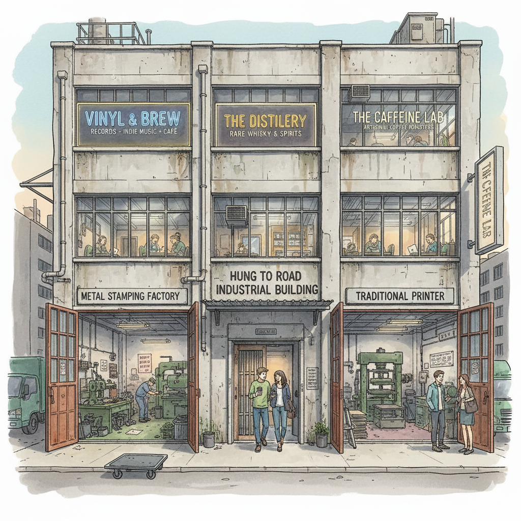 Plutôt que d'être démolis, les anciens bâtiments d'usine ("工廈") de Kowloon Bay connaissent une transformation remarquable. Ils abritent aujourd'hui un mélange unique d'ancien et de nouveau : de petits ateliers traditionnels (métallurgie, imprimerie) coexistent avec des entreprises créatives et tendance. On y trouve des librairies musicales, des boutiques de whisky de spécialité, des torréfacteurs de café, mais aussi des marchands de biens d'occasion (夜冷) et des sociétés pharmaceutiques (藥業公司).