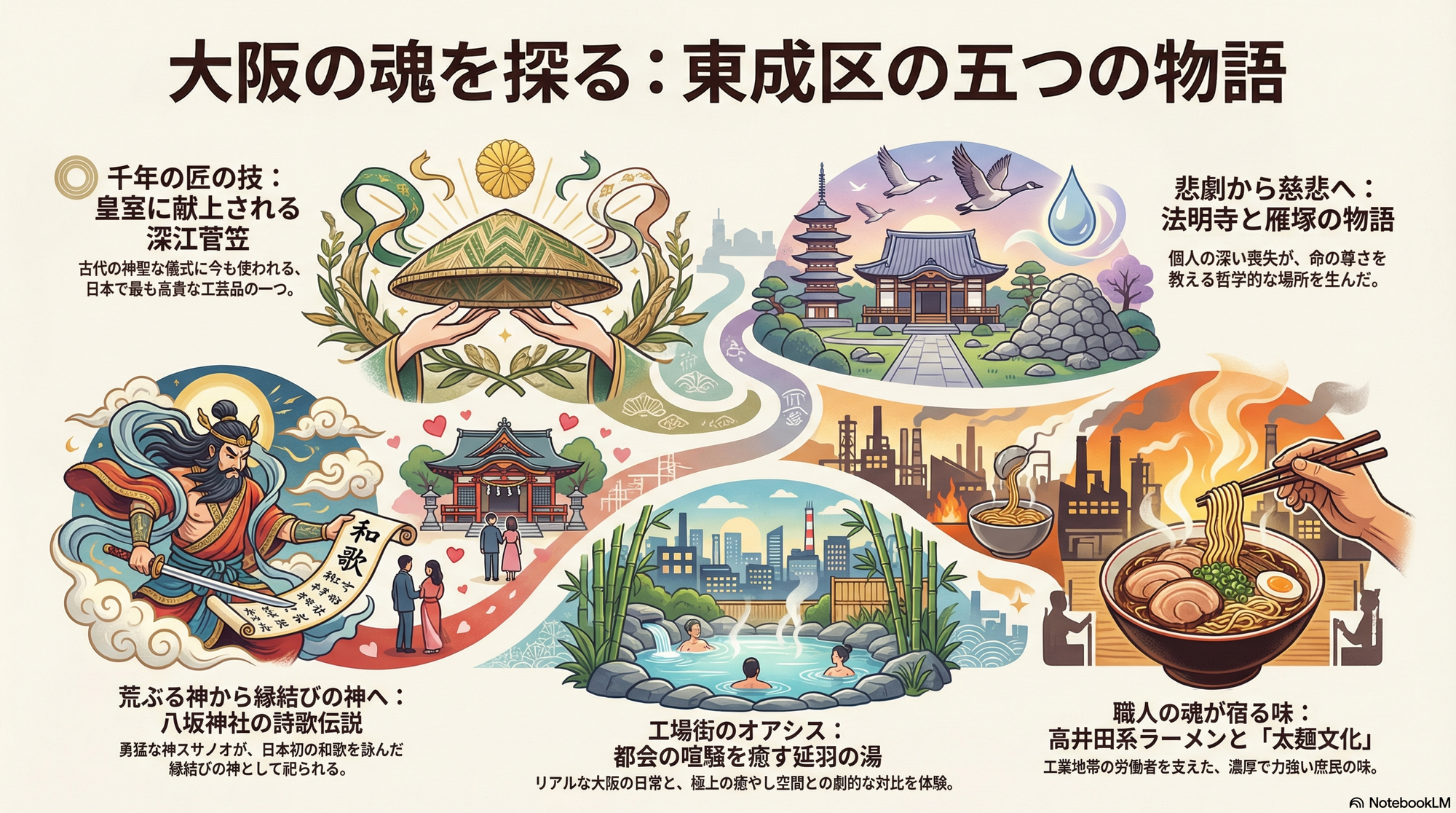 大阪市東成区。初めて訪れる者にとっては、大規模な観光名所もなく「目立たない」場所に映るかもしれません。しかし、その飾らない風景の奥には、実は「大阪で最も深い歴史の回廊」が広がっています。この地は、古代の神聖な儀式から中世の深い悲しみ、近代産業の力強さ、そして現代の癒しまで、幾重にも重なる物語を抱いているのです。