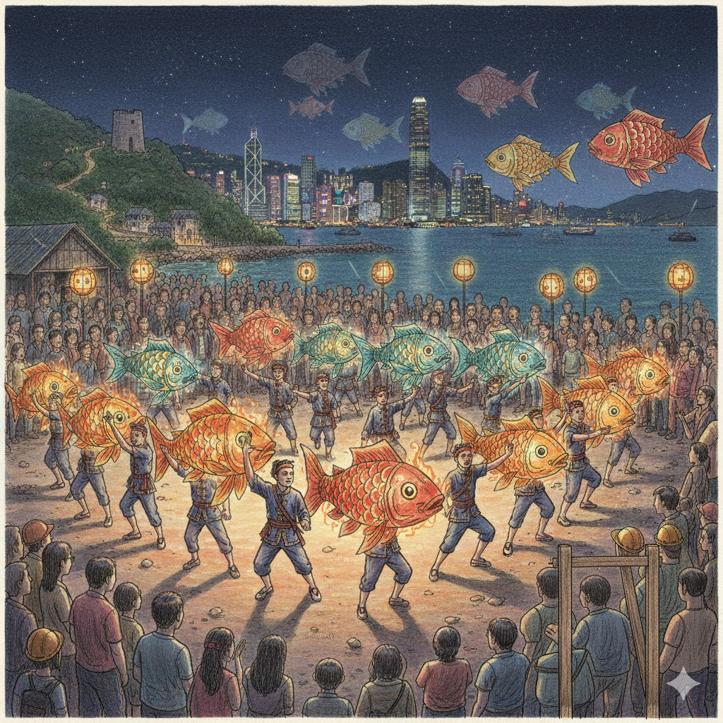 この幻想的な踊りは、明朝末期から清朝初期に起源を持つとされ、**沙頭角の沙欄嚇村(シャーランハヴィレッジ)**に伝わる、漁師たちが海の神々への畏敬と豊漁への願いを込めて舞う伝統芸能です。夜の闇の中、数十人の男性が様々な魚をかたどった灯籠を手に、まるで水中の精霊のように舞い踊る光景は、見る者を幽玄の世界へと誘います。