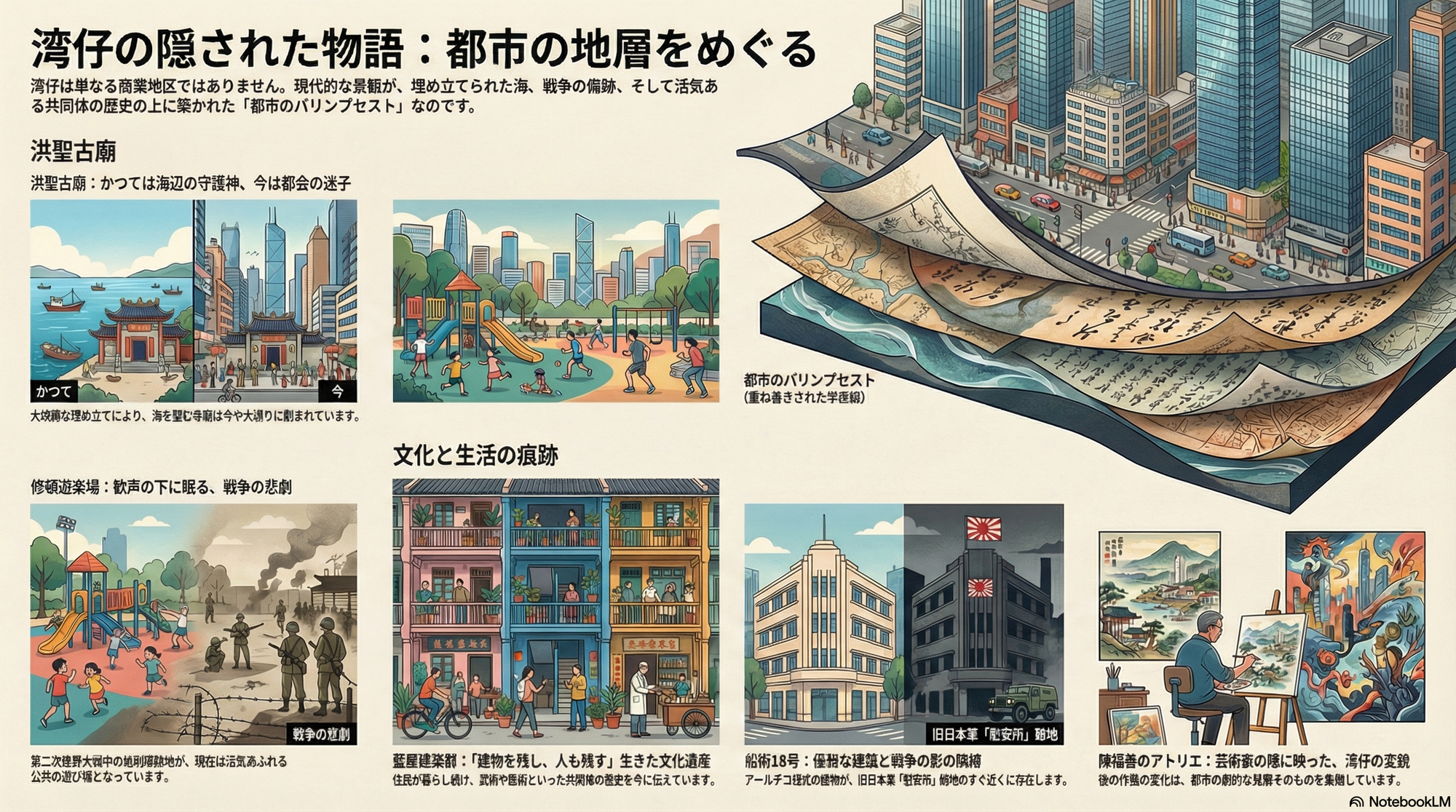 灣仔の物語は、この街が常に過去の上に現在が書き重ねられてきた「都市の拓片(パリンプセスト)」であることを教えてくれます。私たちが見るきらびやかな日常は、かつての海湾、戦場、そして人々の生活の上に築かれているのです。