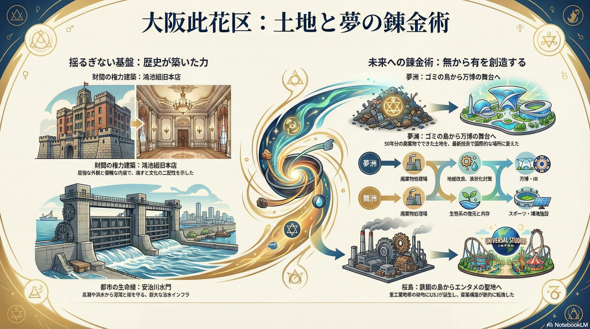 ユニバーサル・スタジオ・ジャパン(USJ)の歓声、そして2025年大阪・関西万博が開催される夢洲の輝かしい未来。大阪市此花区と聞いて多くの人が思い浮かべるのは、こうした現代的なランドマークかもしれません。しかし、そのきらびやかな表面の下には、自然との格闘、産業の興亡、そして絶え間ない革新が織りなす、より深く、よりドラマチックな物語が眠っているとしたらどうでしょう。この記事では、此花区という土地そのものが記してきた「自伝」を解き明かす、5つの隠された叙事詩へと皆様を誘います。それは、この土地の真の魂を探る旅です。