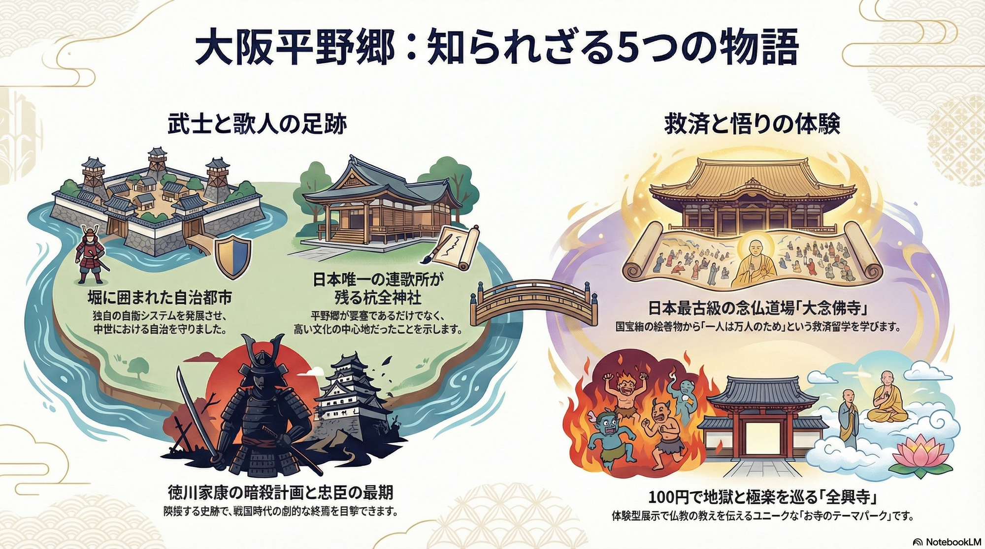環濠という町の硬い皮膚から始まった私たちの旅は、豪商たちが育んだ文化的な心臓、歴史の渦中で下された政治的な決断、そして地獄と極楽を巡る死生観を経て、ついに「一人は万人のために」という共同体の魂へと辿り着きました。これら五つの物語は、平野郷という町の精神的な解剖図を、見事に描き出していたのです。