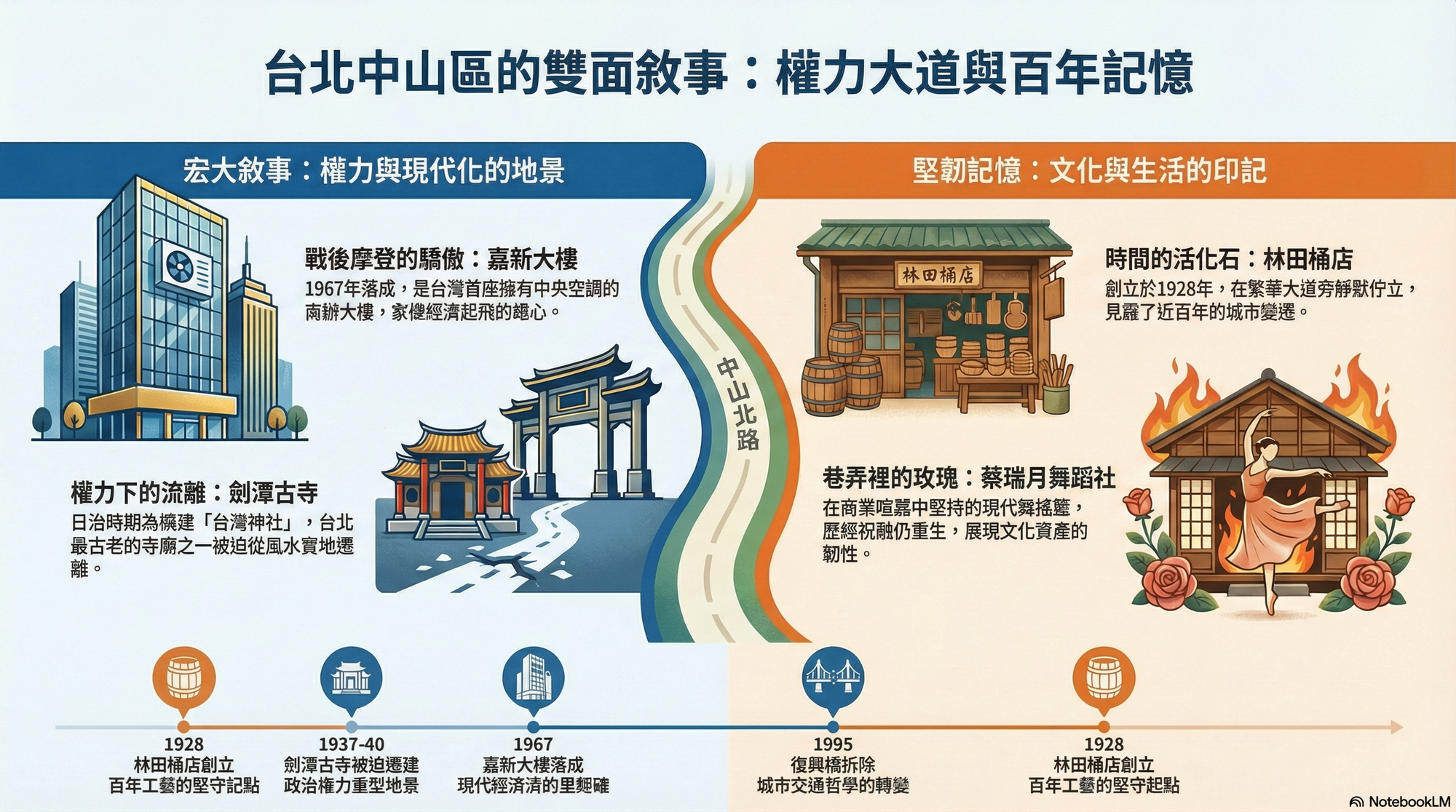 中山区のアイデンティティが、政治権力、経済的野心、文化的喪失、そして力強い再生の糸で織られた複雑なタペストリーであることを示しています。 復興橋のような壮大なプロジェクトが時代の要請と共に儚く消え去る一方で、林田桶店や蔡瑞月舞蹈社のような文化的な記憶は、驚くほどの粘り強さで生き続けています。