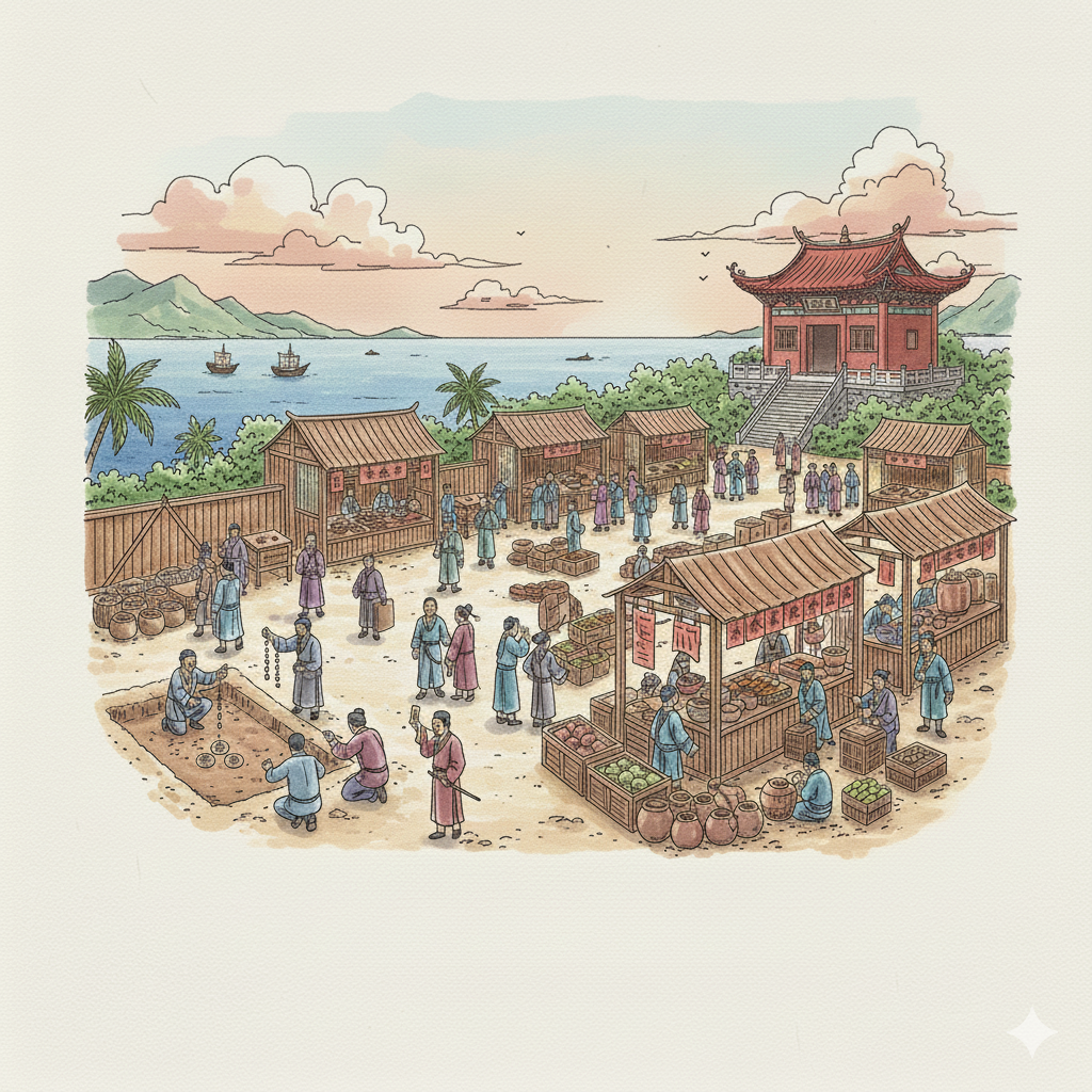 この時代の隠された宝石は、歴史の連続性を物語る二つの場所にあります。一つは、外国船が停泊した歴史的な海岸線である「龍鼓灘の古代海岸線」。もう一つは、軍事拠点から商業中心地への変遷を辿る上で欠かせない、「屯門舊墟(旧市場)」の歴史的な場所です。市場自体は失われましたが、その跡地、近隣の天后廟、そしてさらに時代を遡る掃管笏遺跡で発見された漢代の五銖銭を結びつけることで、漢代の交易拠点から唐宋の帝国要塞、そして地域の商業中心地へと至る、二千年以上にわたる発展の軌跡を描き出すことができるのです。