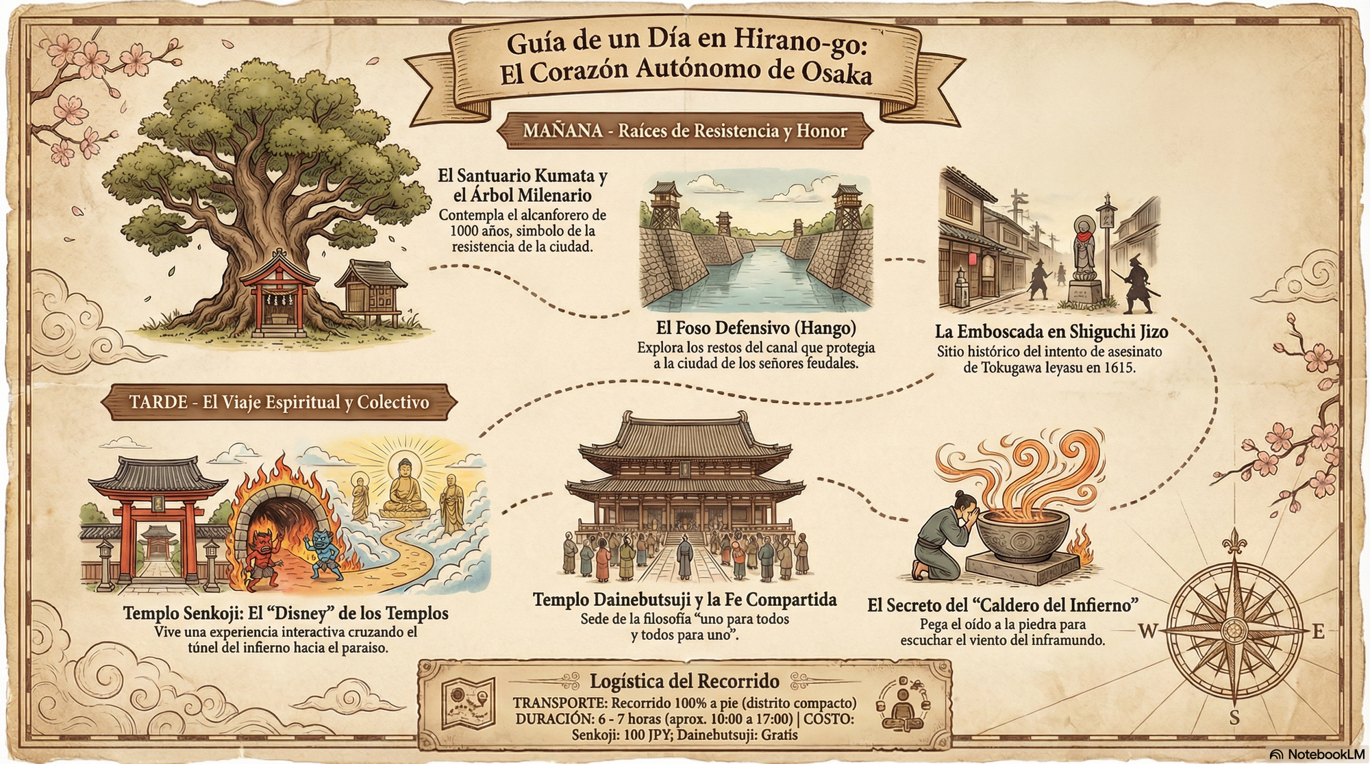 Cuando uno piensa en Osaka, la mente se inunda de luces de neón, multitudes enérgicas y una gastronomía que domina la escena mundial. Es una metrópolis que vive en el presente, vibrante e implacable. Pero, ¿y si le dijera que a pocos pasos de este torbellino moderno existe un mundo detenido en el tiempo? Un lugar donde los ecos de samuráis, mercaderes rebeldes y conspiraciones políticas aún resuenan en calles silenciosas. Este lugar es Hirano-go, una antigua ciudad autónoma que desafía todo lo que creíamos saber sobre Osaka. Este artículo no es una simple guía turística; es la llave para abrir cinco puertas a un pasado sorprendente, revelando las historias que hacen de este barrio un destino de una profundidad inesperada. Acompáñeme en este viaje en el tiempo para descubrir el alma oculta de una ciudad que se atrevió a ser libre.