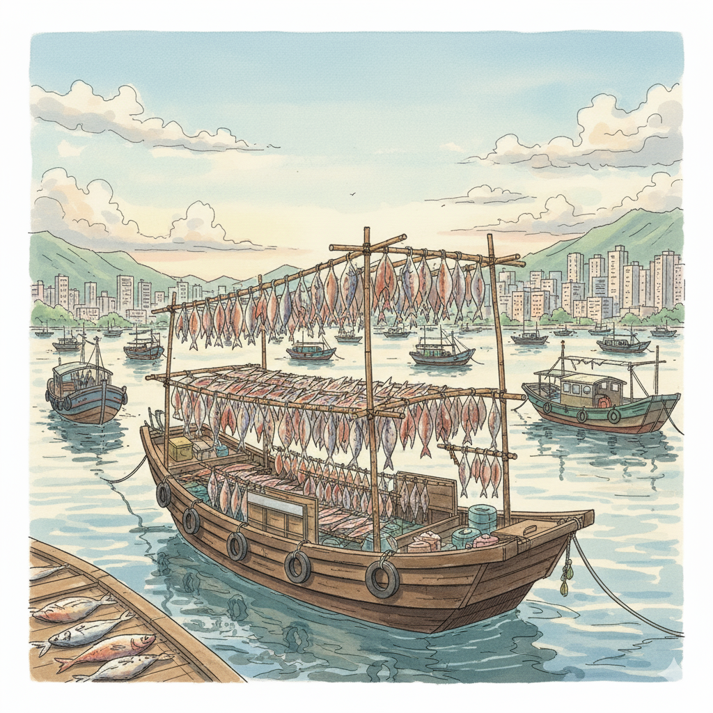 Um dos barcos mais fascinantes eram os barcos 'Saan Ka' (曬家船). Eram barcaças sem motor que serviam tanto de casa como de oficina. Nos seus conveses, os pescadores secavam lulas e peixe salgado, um ofício que definia a economia do porto mas que hoje está quase extinto.