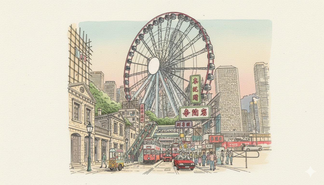 A joia escondida que emerge desta história de sacrifício é a Hong Kong Observation Wheel. Erguendo-se precisamente nesta terra recuperada, uma "paisagem puramente não histórica", a roda-gigante oferece uma vista espetacular. No entanto, a experiência é profundamente impulsionada pela memória. Ao desfrutar da paisagem, estamos sobre um terreno criado à custa de uma memória coletiva, um lembrete de que a vista não é apenas sobre a beleza do porto, mas também sobre as dramáticas transformações e as histórias que foram submersas para que esta nova paisagem pudesse nascer.