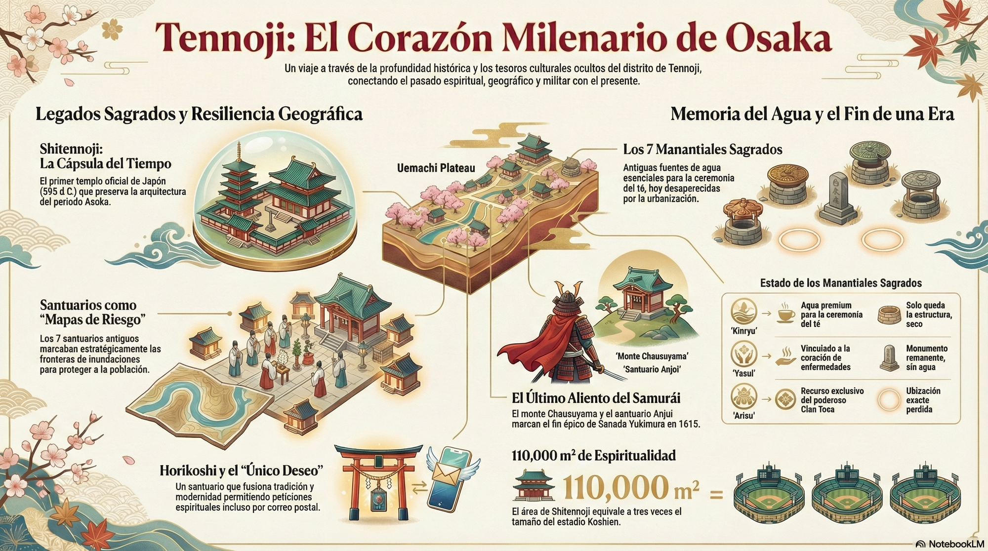 Tennōji es mucho más que un distrito; es un palimpsesto donde la historia se reescribe constantemente sobre sí misma. Aquí, la tragedia de un héroe como Sanada Yukimura no ocurrió en un vacío, sino sobre la misma tierra que los antiguos habían delimitado con santuarios para protegerse de las aguas. La fe moderna que se envía por correo desde Horikoshi coexiste con los fantasmas de las fuentes perdidas que alguna vez nutrieron esa misma fe. Cada paso que damos en sus calles es un paso sobre estas capas invisibles. La próxima vez que visite Tennōji, recuerde mirar más allá de lo evidente y escuchar los ecos de los siglos.