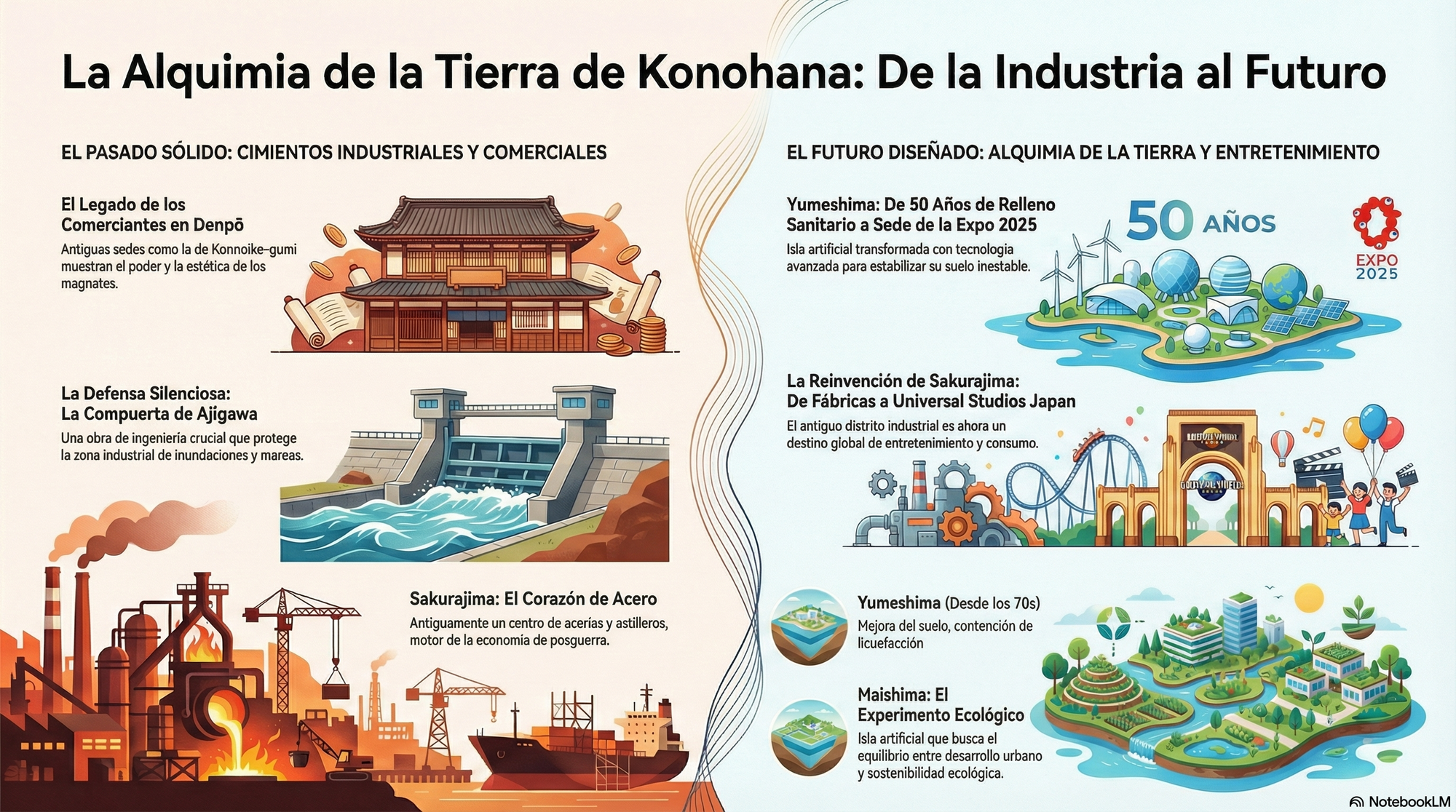 Cuando se piensa en el distrito de Konohana en Osaka, la mente suele volar hacia las luces brillantes y la fantasía de Universal Studios Japan. Sin embargo, bajo la superficie de este epicentro del entretenimiento moderno, se esconde una épica "autobiografía de la tierra". Es la crónica del viaje de un distrito desde una "sólida fundación" anclada en la historia hasta un "futuro suspendido" sobre islas nacidas de la tecnología. Esta narrativa no es solo una secuencia de eventos, sino una poderosa "dialéctica geográfica": la tensión entre un alma arraigada en la tierra firme tradicional y otra que flota sobre un horizonte creado por la voluntad humana. A continuación, le guiaremos a través de cinco de estas sorprendentes historias, revelando los tesoros ocultos de un lugar que encarna el espíritu de Osaka.