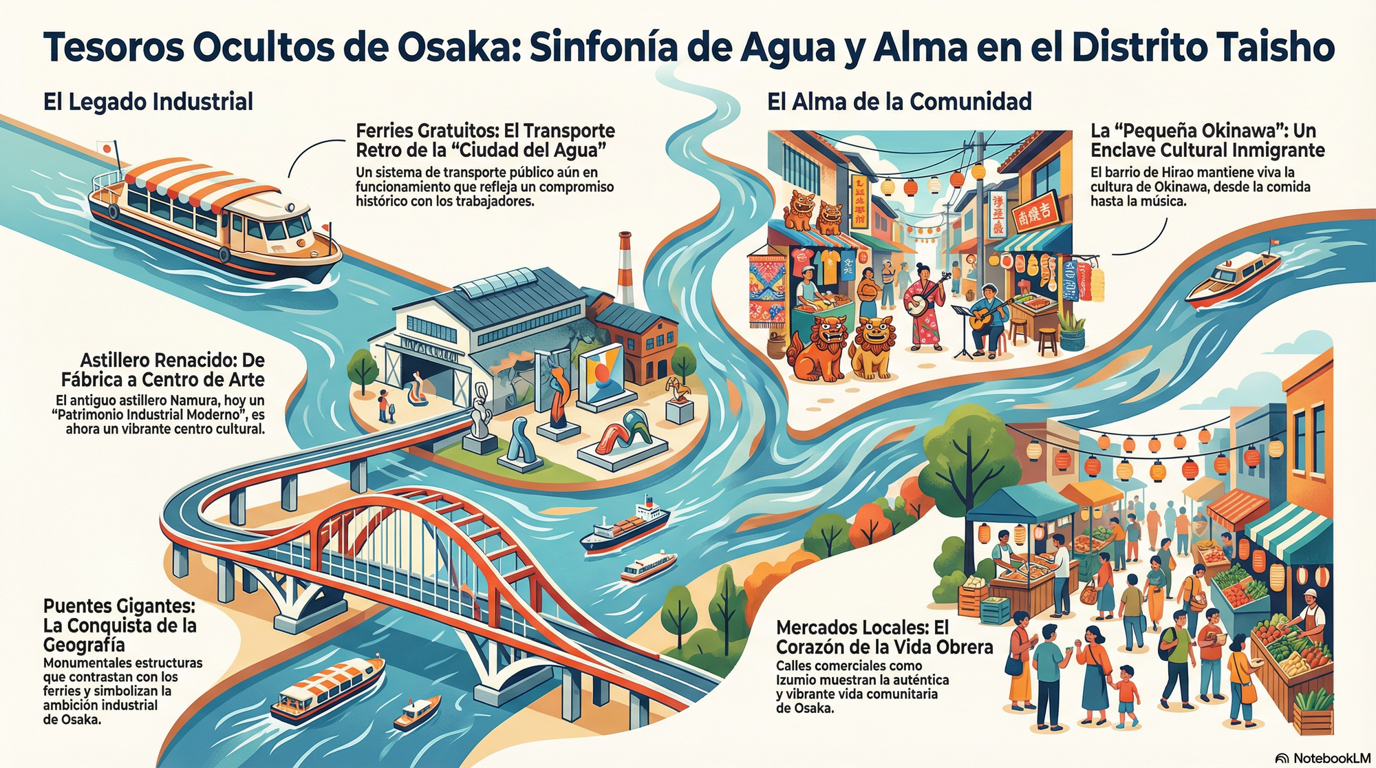 Rodeado por las aguas de los ríos 尻無川 (Shirinashigawa) y 木津川 (Kizugawa), Taisho es geográficamente una isla, un antiguo corazón industrial cuyo relativo aislamiento ha preservado un alma única. Lejos de las luces de neón del centro de Osaka, este distrito atesora una serie de tesoros inesperados que narran una épica de ingeniería, migración, resiliencia y comunidad. Este artículo se adentra en este fascinante paisaje para revelar cinco historias sorprendentes que, juntas, componen la sinfonía de agua y alma de Taisho.
