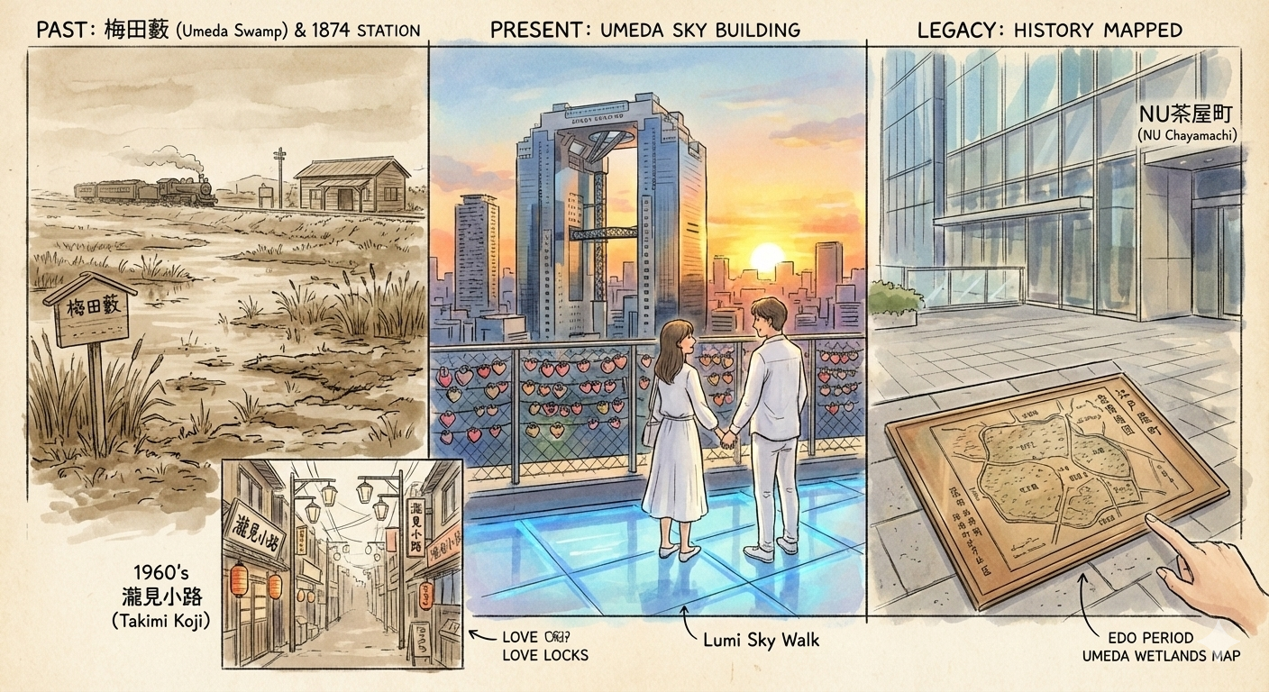 Hace apenas 300 años, el área que hoy conocemos como Umeda era una zona pantanosa y húmeda llamada "梅田藪" (Umeda Yabu), una tierra de pescadores de anguilas y recolectores de almejas, marcada en los mapas como "no apta para vivir". Los mosquitos en verano y los vientos helados en invierno la hacían un lugar inhóspito en los márgenes de la civilización.