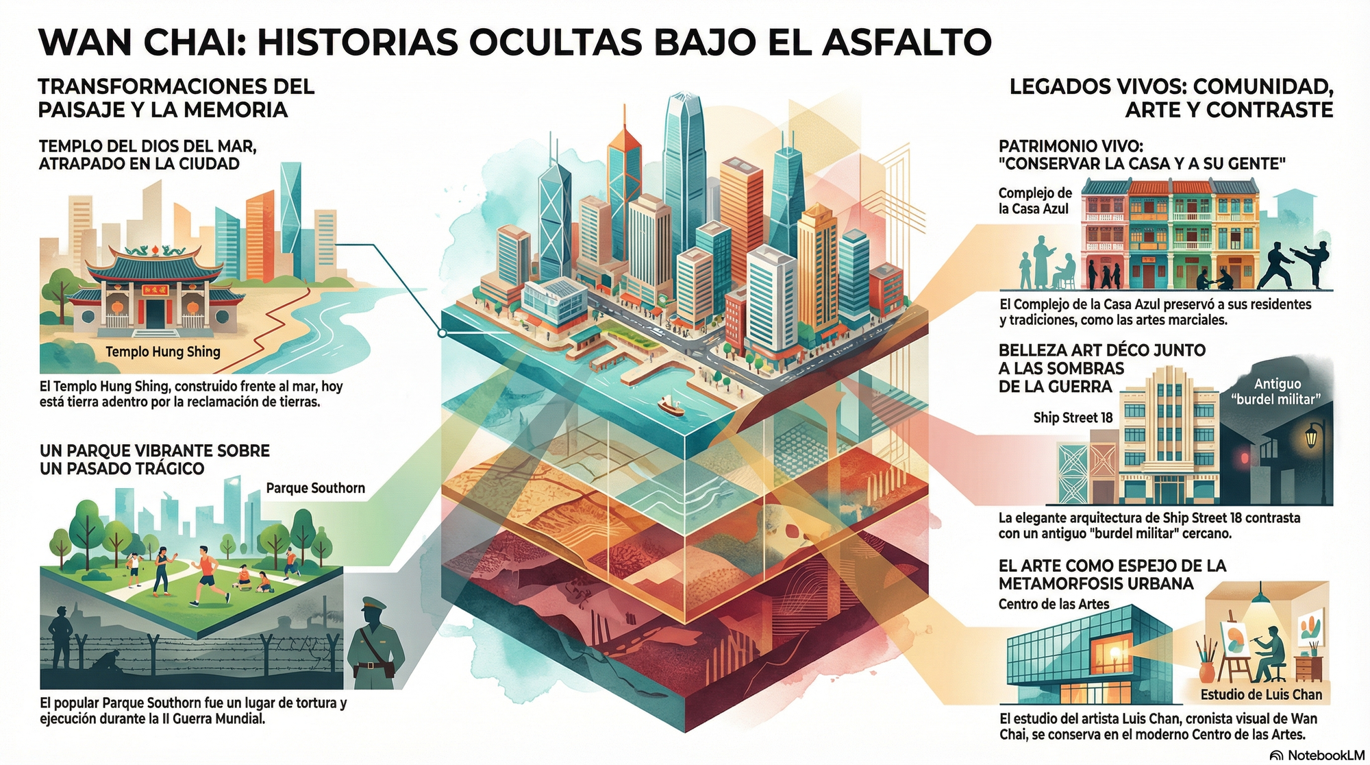 Wan Chai es, en esencia, un "Palimpsesto Eterno", un lugar donde el presente se construye directamente sobre las texturas estratificadas y ocultas del pasado. La prosperidad y modernidad que vemos hoy no son más que la capa más reciente, escrita sobre antiguos golfos, campos de batalla, comunidades pesqueras y vecindarios que se niegan a desaparecer por completo.