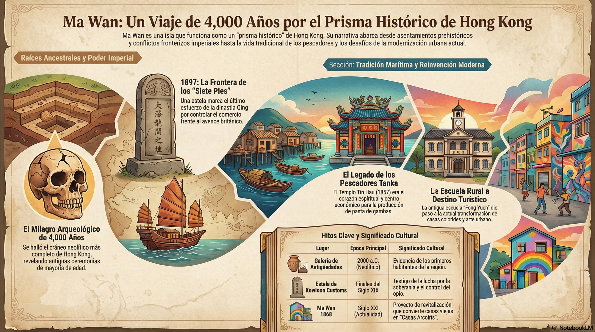 Para la mayoría, Ma Wan es una silueta fugaz vislumbrada desde el Puente Tsing Ma, el espectacular viaducto que conecta el aeropuerto de Hong Kong con el mundo. Es un lugar que se cruza, no que se visita. Sin embargo, bajo este barniz de modernidad y movimiento incesante, yace una historia profunda que se extiende a lo largo de 4,000 años. Desde los rituales de las primeras comunidades neolíticas hasta los dramas fronterizos de la Dinastía Qing, Ma Wan es una isla de memoria estratificada. Este artículo te guiará en un viaje a pie a través de cinco historias transformadoras, revelando las capas ocultas que componen la verdadera y compleja identidad de este fascinante lugar.