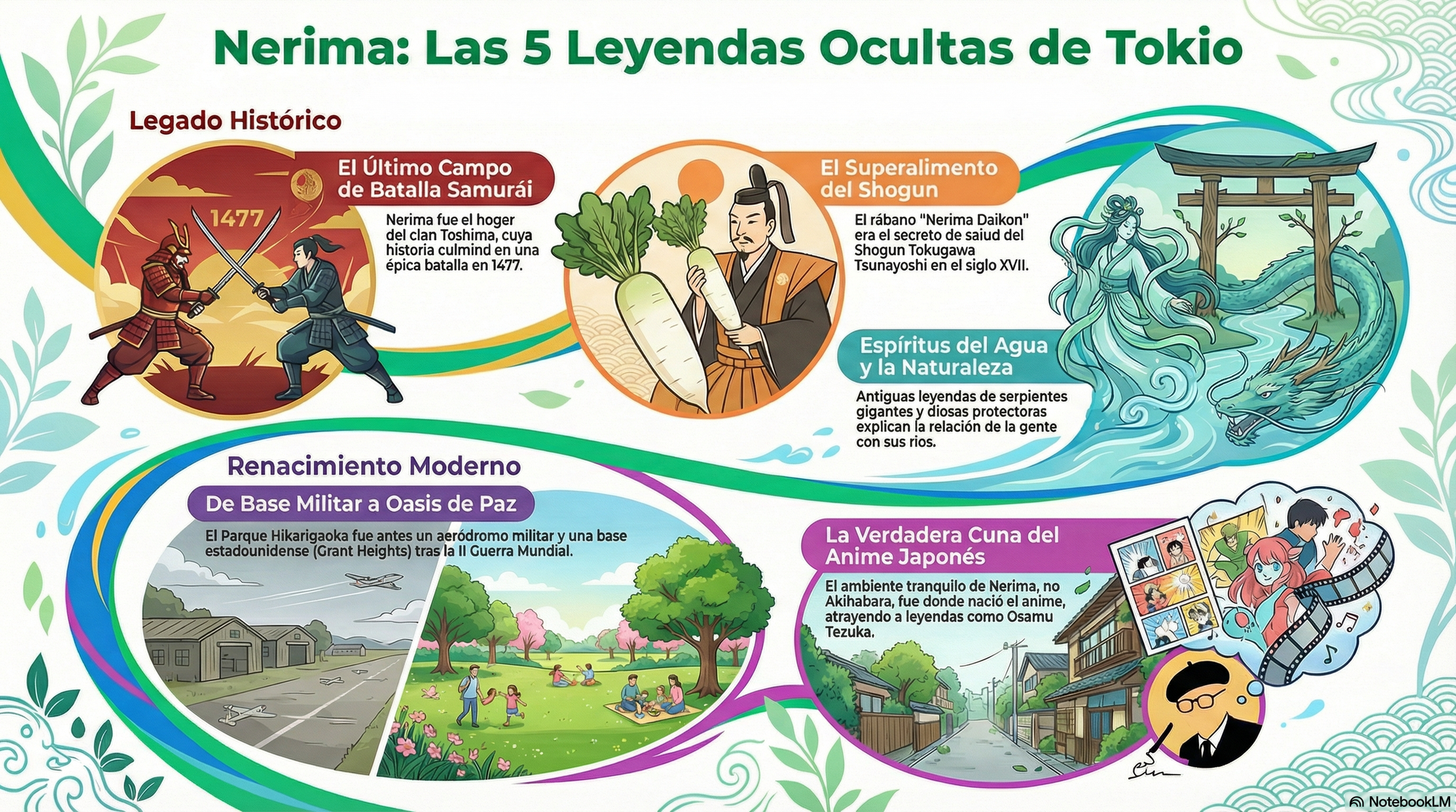 Sin embargo, bajo su apacible superficie, Nerima no es un simple suburbio. Es el escenario de una microépica sobre la regeneración de la tierra y la reinvención de la identidad. Cada rincón de este lugar ha sido un campo de batalla, un retiro imperial, una base militar extranjera y, finalmente, la cuna de una revolución cultural. ¿Estamos listos para descubrir cómo la historia de Tokio se ha forjado en sus márgenes silenciosos? Acompáñenos en un viaje a través de cinco leyendas que revelan cómo este apacible distrito ha sanado, transformado y nutrido el alma oculta de la capital.