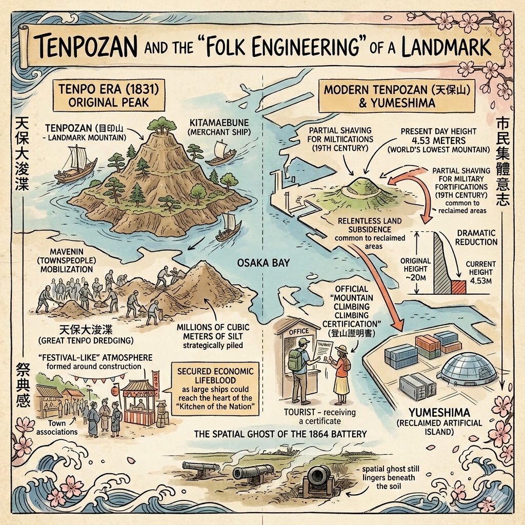 This spatial narrative is best understood through the stark contrast between Tenpozan, a 19th-century marvel of “folk engineering,” and Yumeshima, the modern artificial frontier representing Osaka’s 21st-century expansionism.