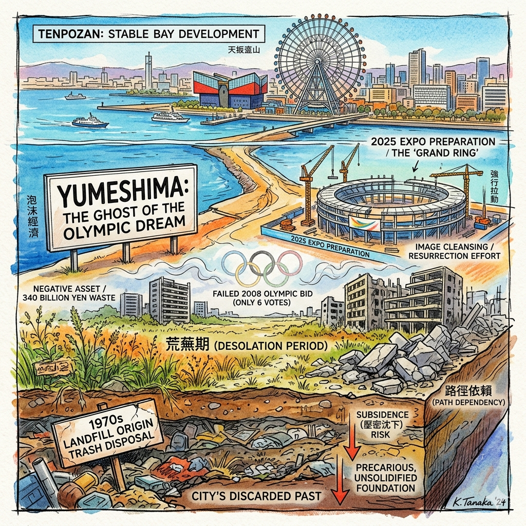 Esta narrativa espacial se comprende mejor a través del marcado contraste entre Tenpozan y Yumeshima, la frontera artificial moderna que representa el expansionismo de Osaka en el siglo XXI.